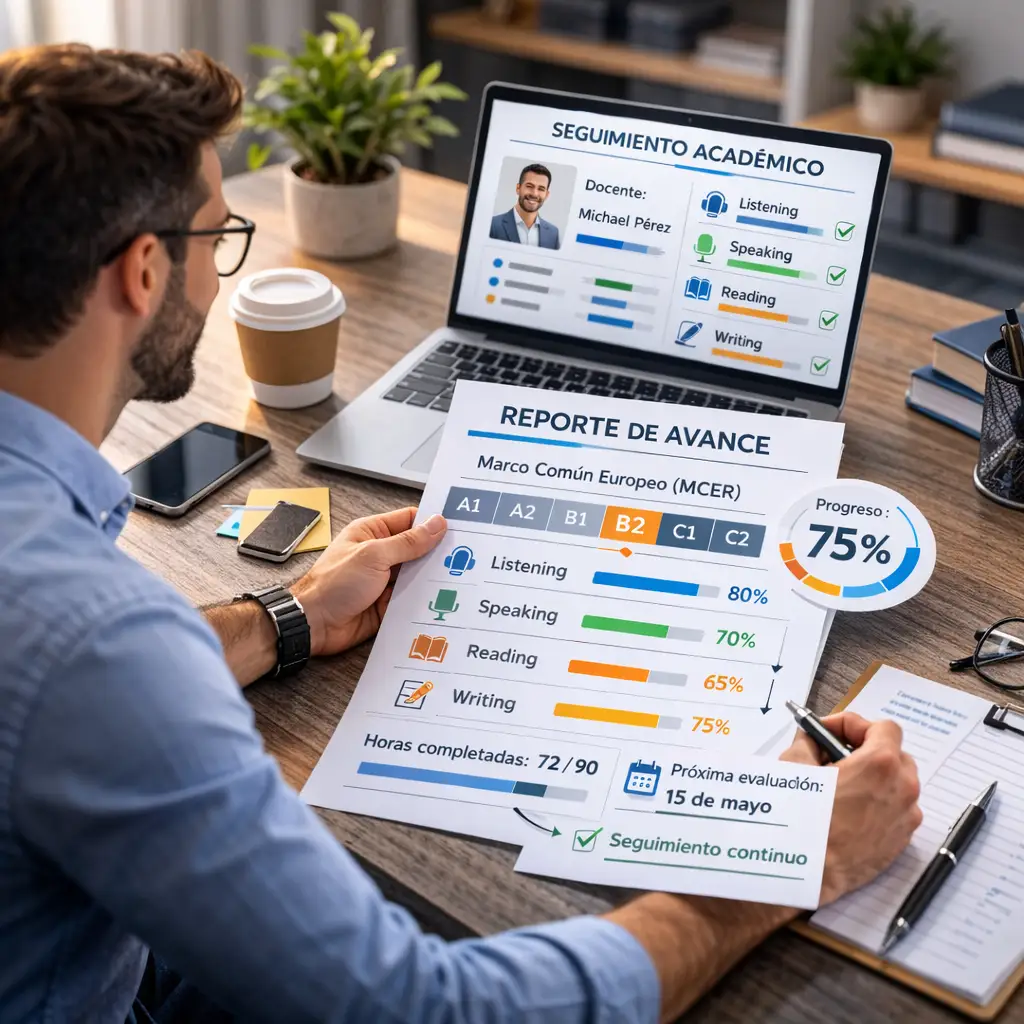 El resultado: sabes exactamente dónde estás, hacia dónde avanzas y cómo mejora tu desempeño en inglés.